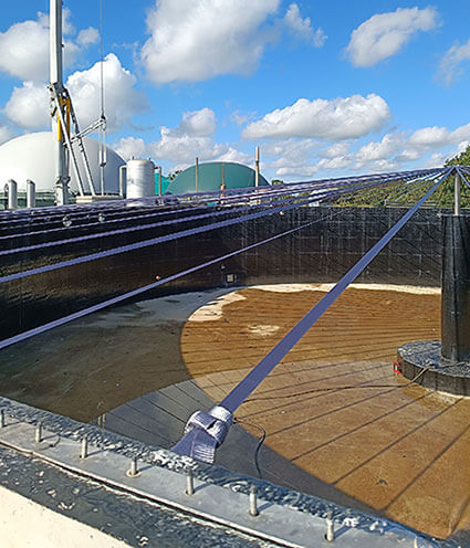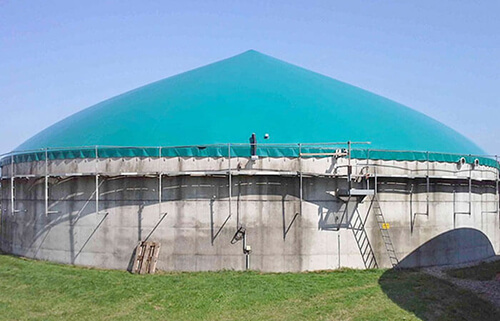 Dieses System ist äußerst robust und beständig. Die Wetterschutzfolie dient zum Schutz der integrierten Gasspeicherfolie vor Witterungseinflüssen. Dadurch wird der Gasspeicher geschont und erzielt eine enorm hohe Lebensdauer. Die Wetterschutzfolie liefern wir Ihnen in allen Standardfarben und auf Wunsch in weiteren Farben Ihrer Wahl! Sie können die Form der Dachkonstruktion wählen. Zur Auswahl stehen Ihnen die Kegeldachkonstruktion und die Kuppeldachkonstruktion. Wir übernehmen alle zugehörigen Arbeiten: Spannseile, Schutznetze, Mittelstütze, Podeste, Über-/Unterdrucksicherung usw.